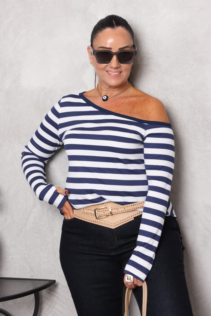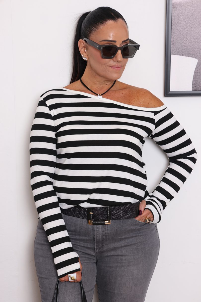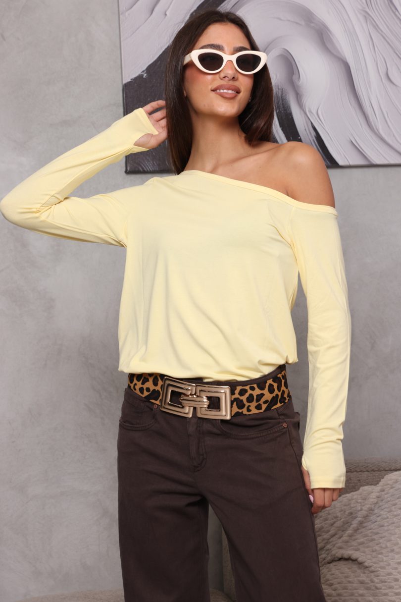 חולצת בייסיק בגזרה א-סימטרית חצי ריטה עם שרוולים ארוכים וכפפה לכנסת האצבע.