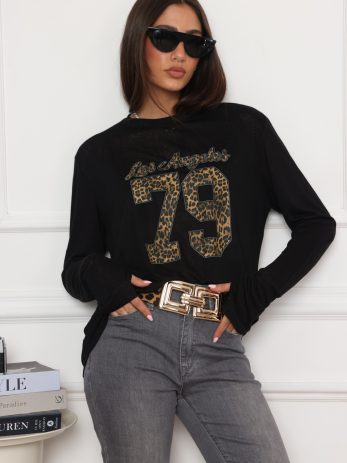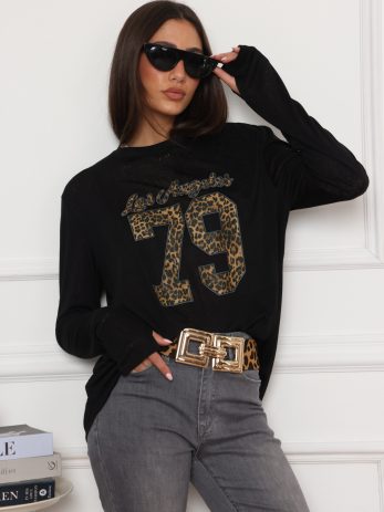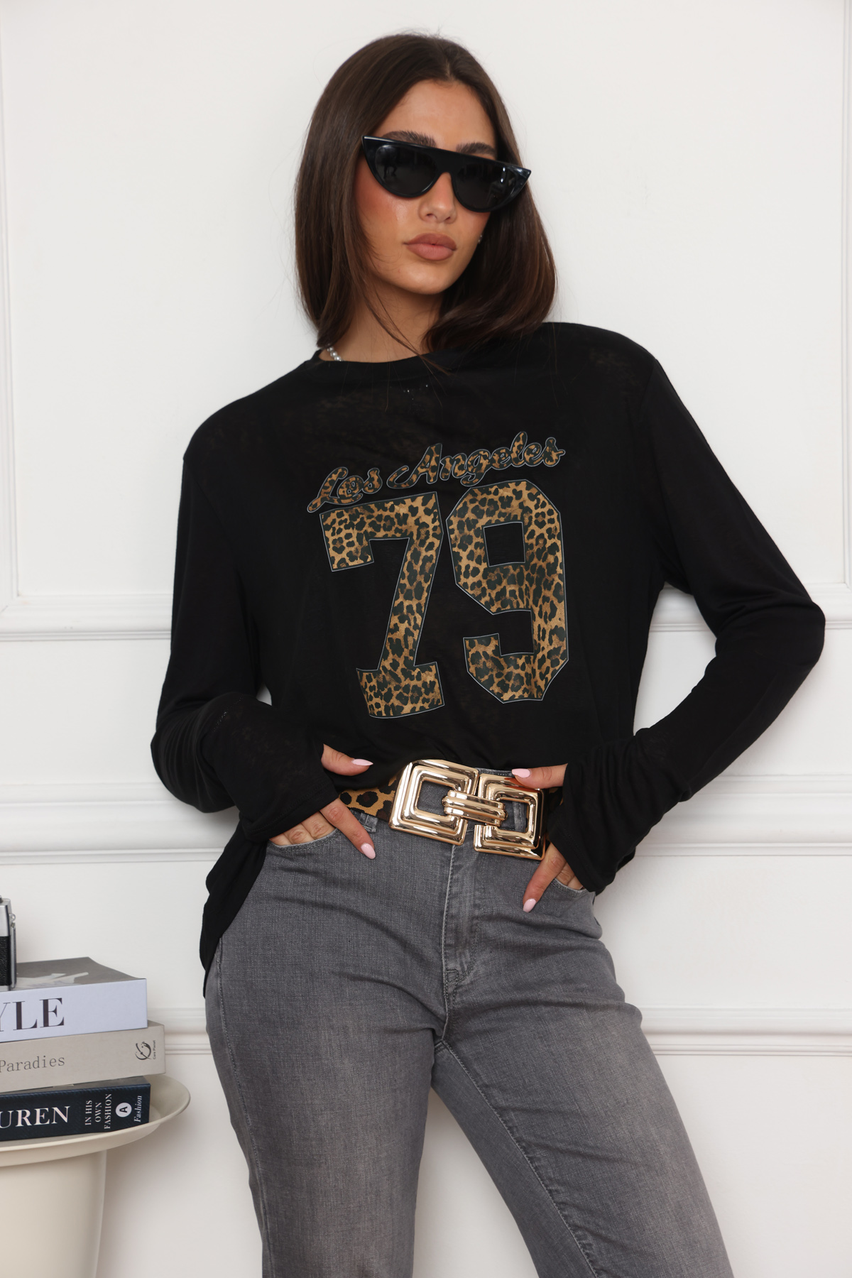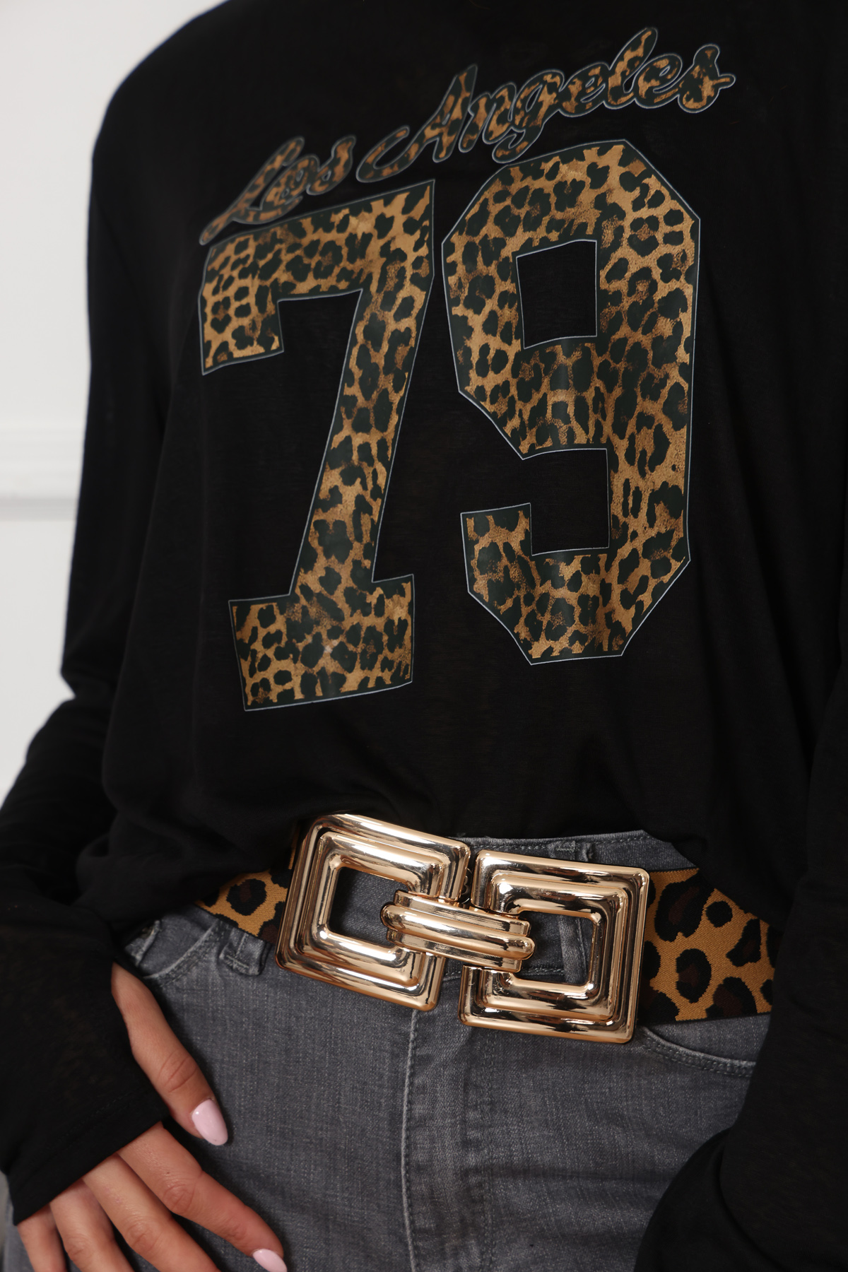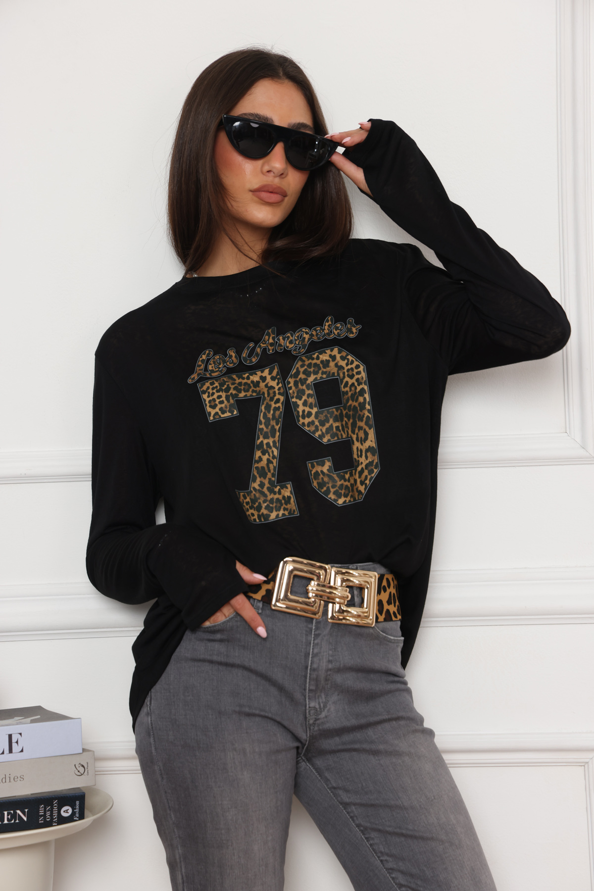 בייסיק ניקי בגזרה הקלאסית והעל זמנית שלנו, עם עיצוב 79 מנומר מקדימה. את החולצה שילבנו עם מכנסי ג'ינס אפור מתרחב – ניתן למצוא בקטגוריית מכנסיים