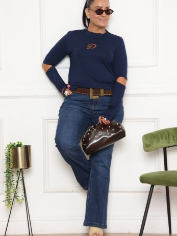 ג'ינס מחטב ומחמיא לגוף בגזרה מעט מתרחבת, לג'ינס שפשופים עדינים ללא קרעים. להשלמת הלוק שילבנו חולצת פתח במרפק