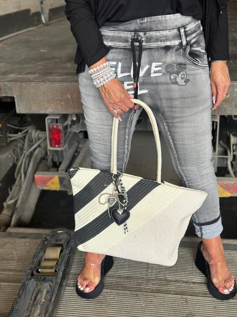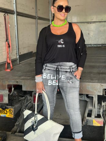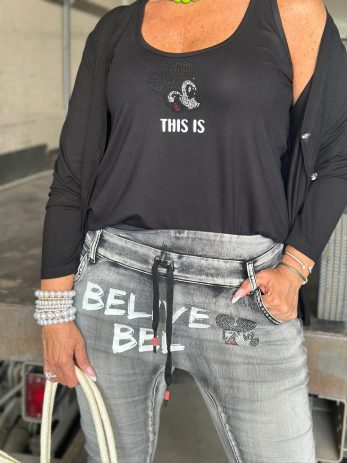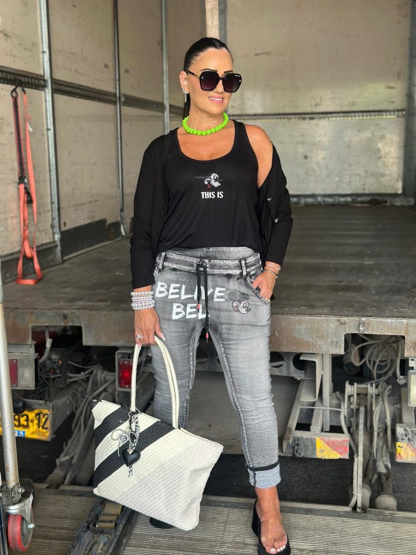 ג'ינס סקי בגזרת סקיני צמודה עם הדפס טקסט ומיקי אבנים, הסקי לא רחב מידי.
