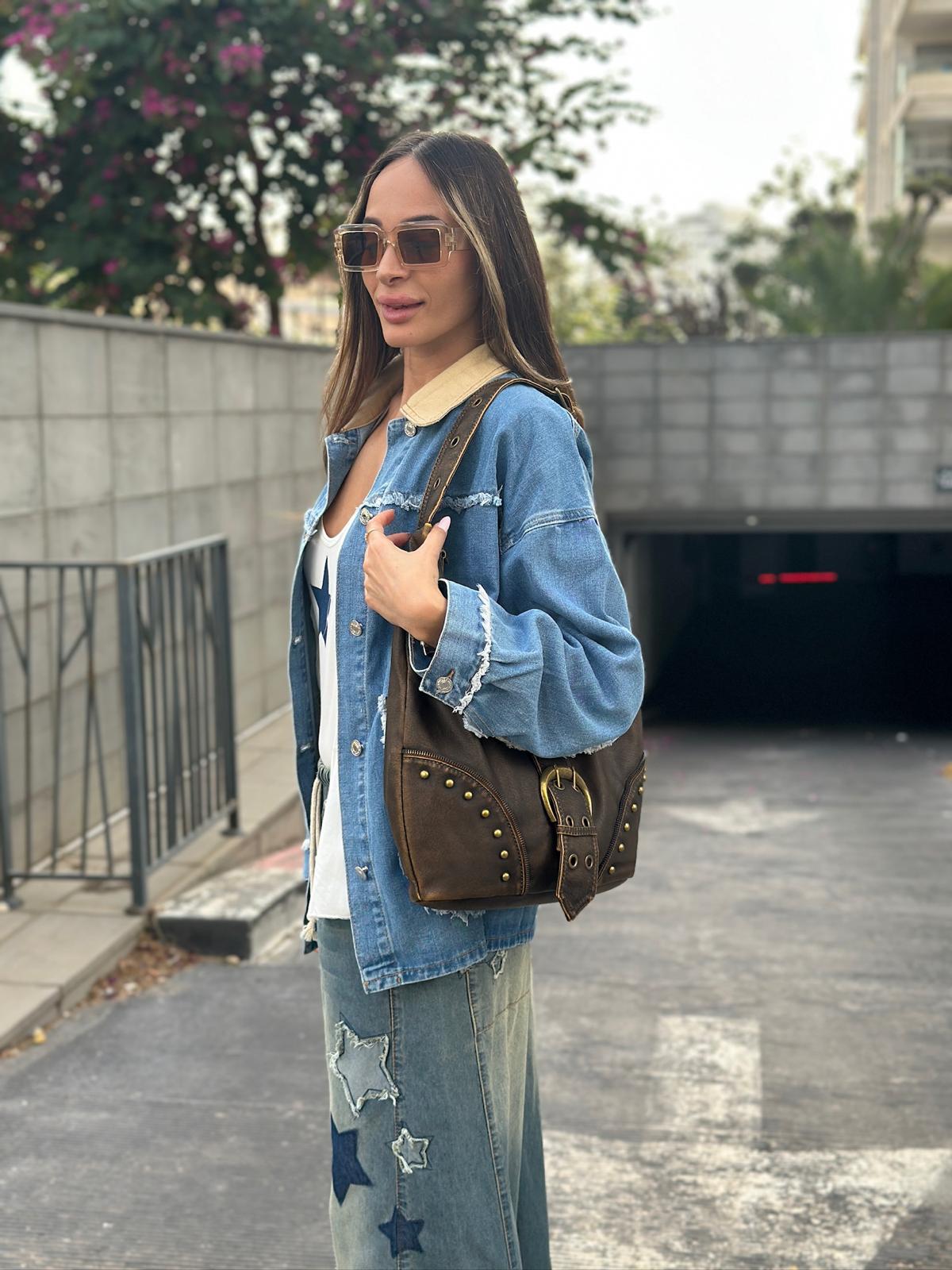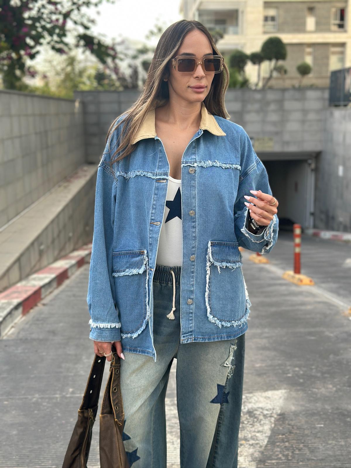 ג'קט ג'ינס משולב צאוורון בהיר, תיפורים פרומים ו-2 כיסים מקדימה