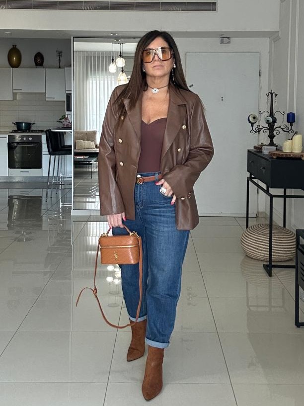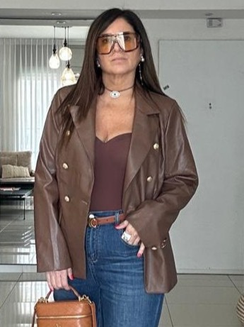 גקט מחוייט דמוי עור חום עם כפתורי זהב
