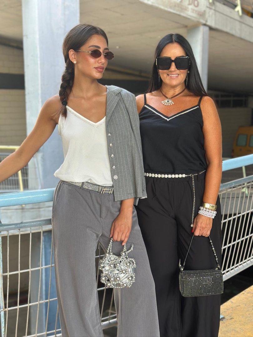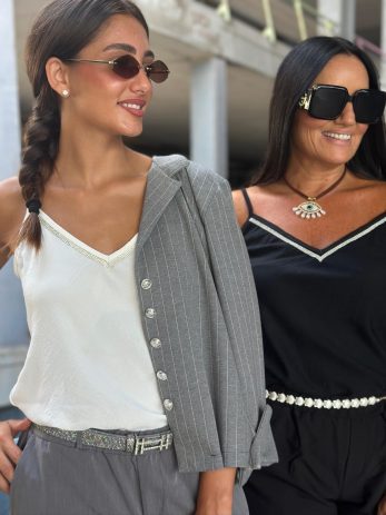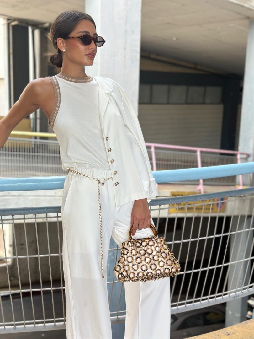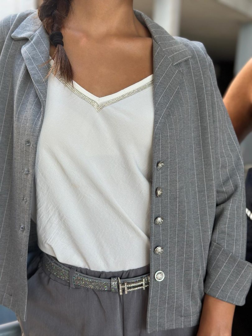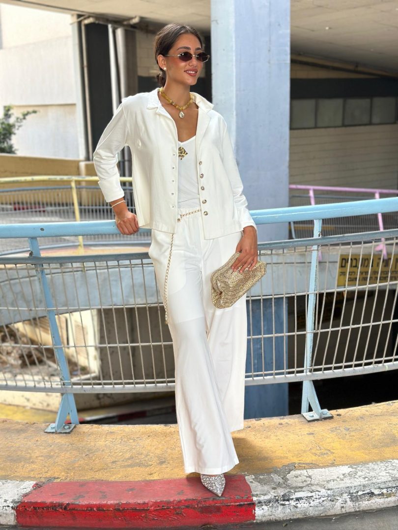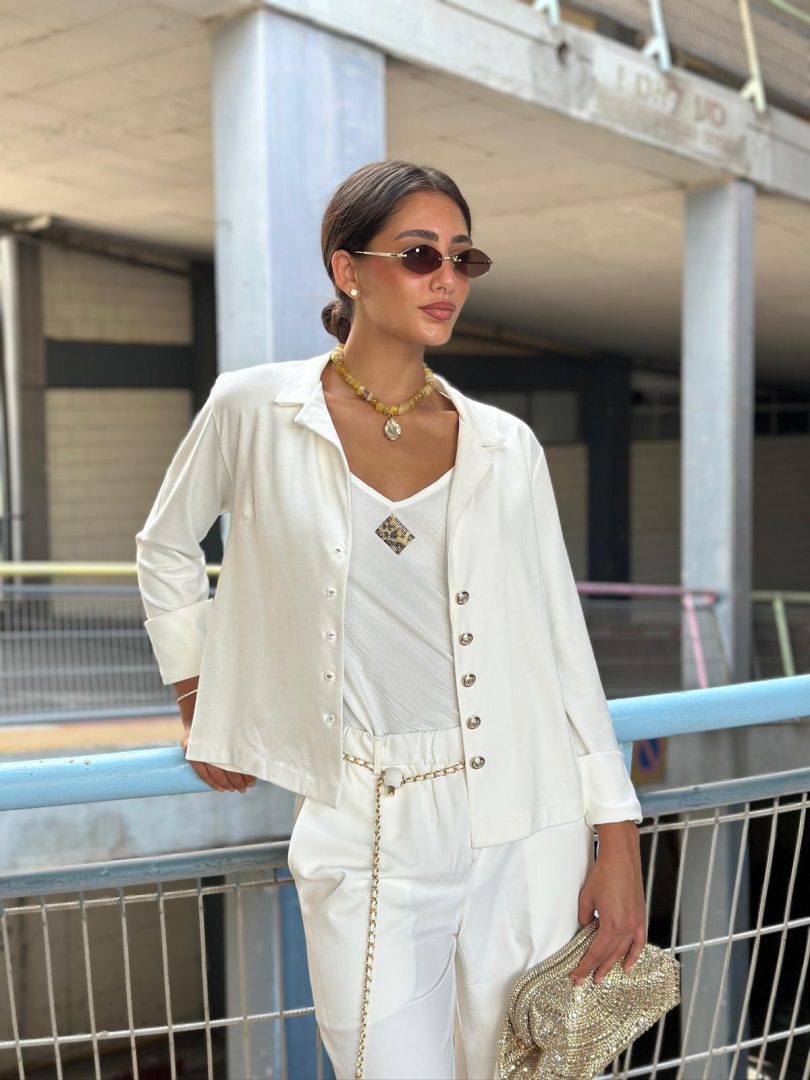 הג'קט משולב כפתורי זהב. את הג'קט האפור שילבנו עם גופיית שטראס אבנים, את הג'קט הלבן שילבנו עם גופיית ריבוע וגופיית סטפני. את כל הגופיות תמצאו באתר בקטגוריית גופיות