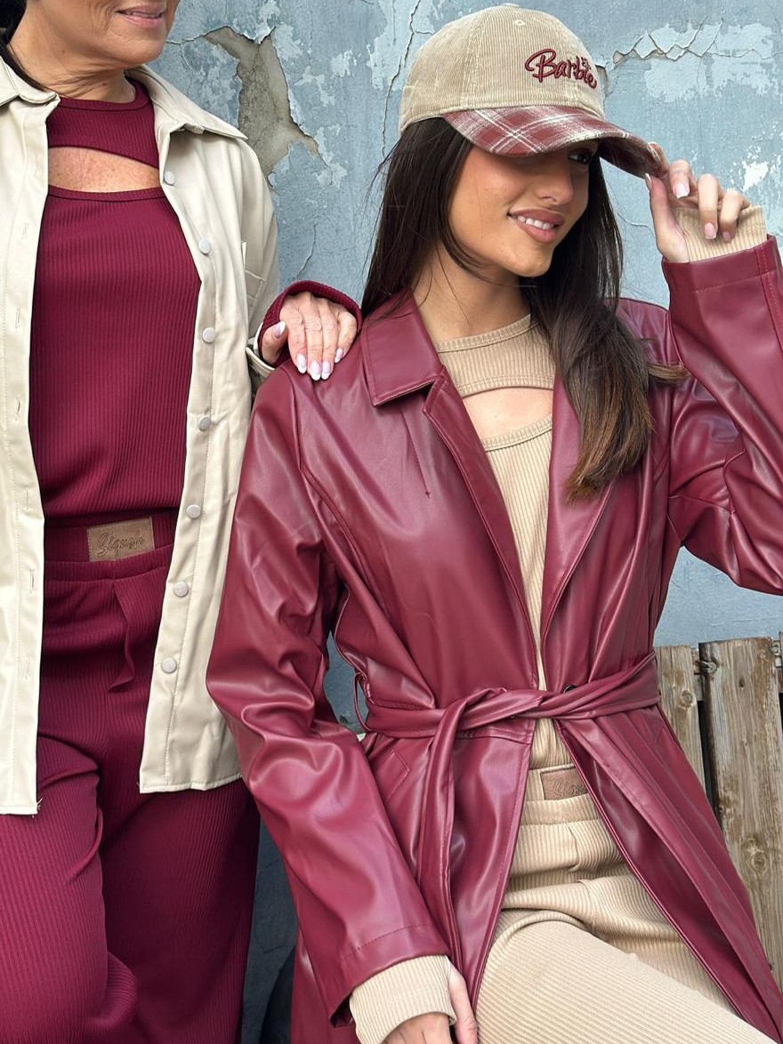 ג'קט דמוי עור משולב חגורה בצבע תואם לקשירה במותן.