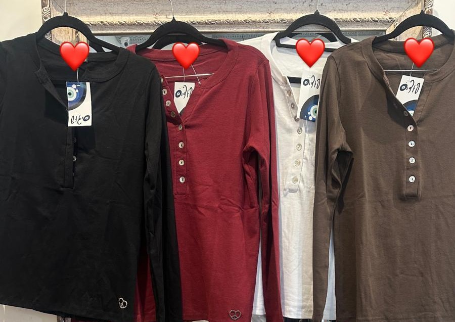 חולצת בייסיק עם שרוולים ארוכים משולבת סגירת כפתורים וכפפה להכנסת האצבע.