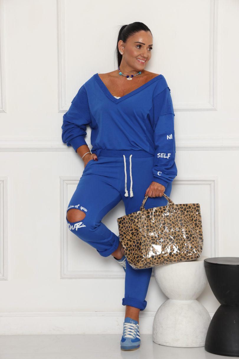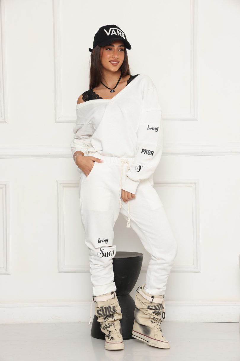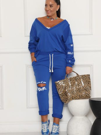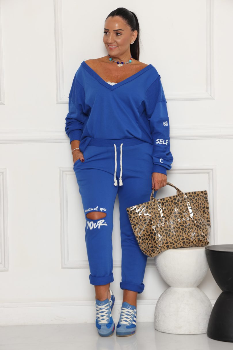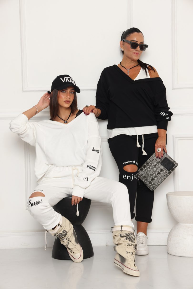 חליפת פנאי 2 חלקים, חולצה בגזרת ריטה עם שרוך קשירה בגב, מכנסיים ארוכים עם קרע בברך ושילוב גומי ושרוך בחלק העליון.
