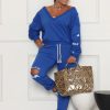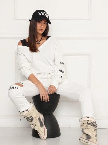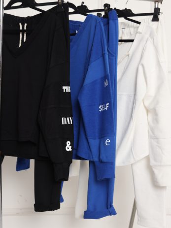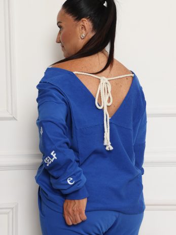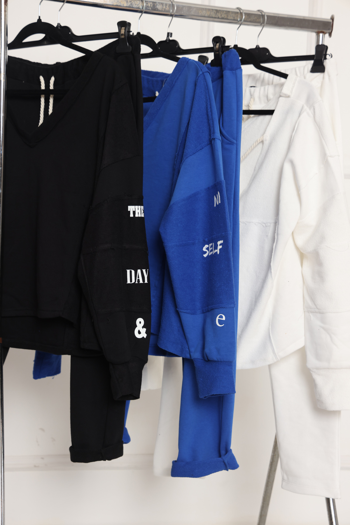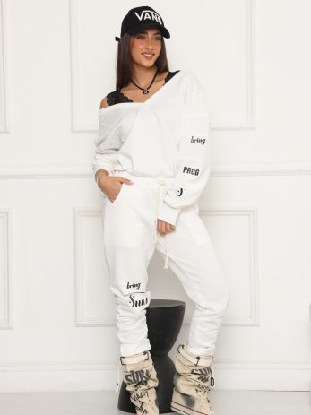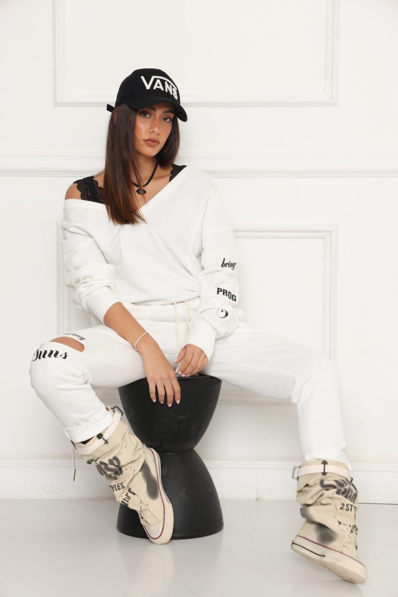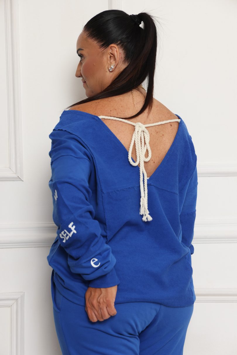 חליפת פנאי 2 חלקים, חולצה בגזרת ריטה עם שרוך קשירה בגב, מכנסיים ארוכים עם קרע בברך ושילוב גומי ושרוך בחלק העליון.