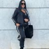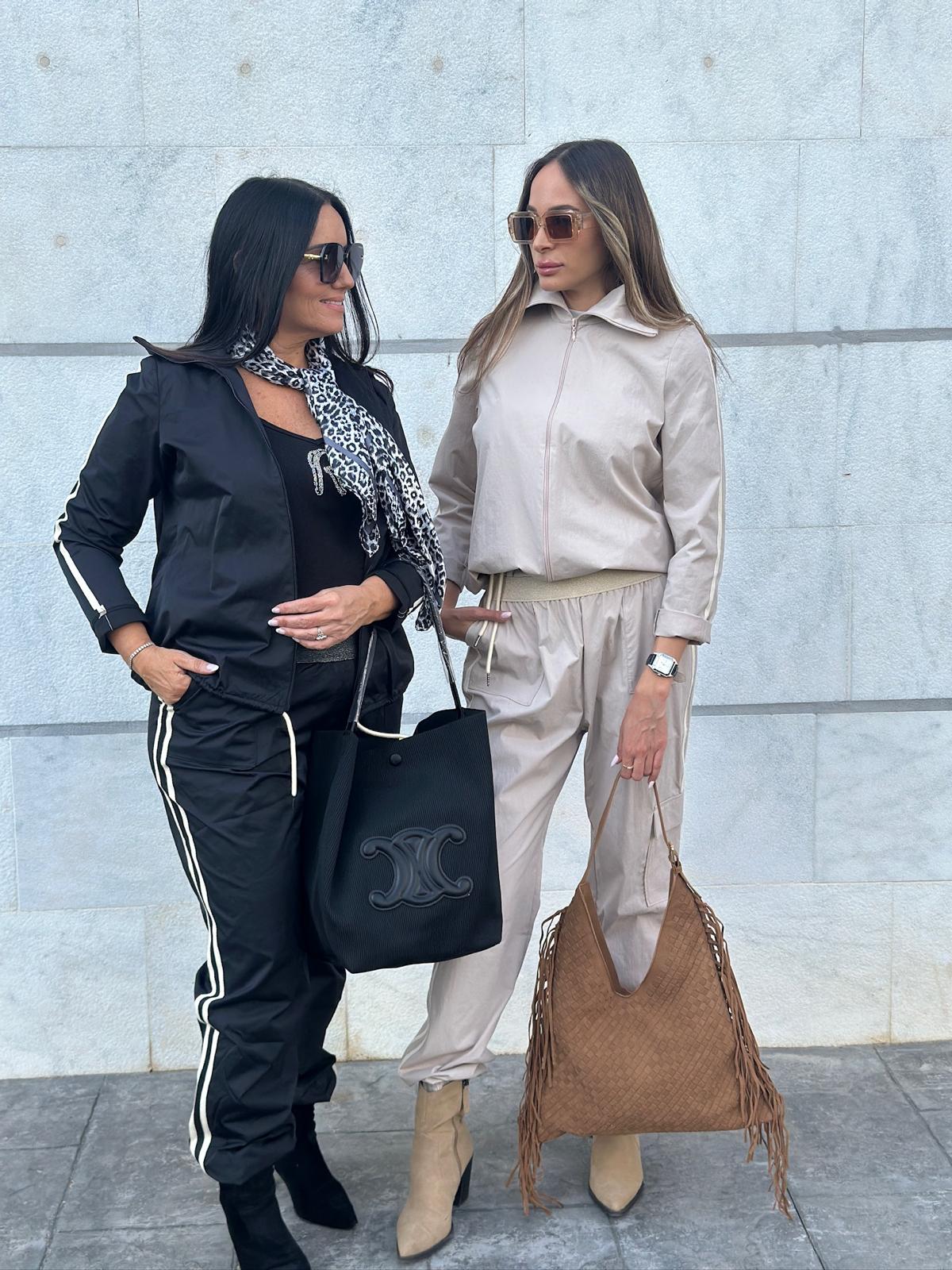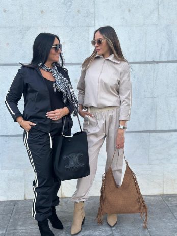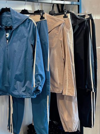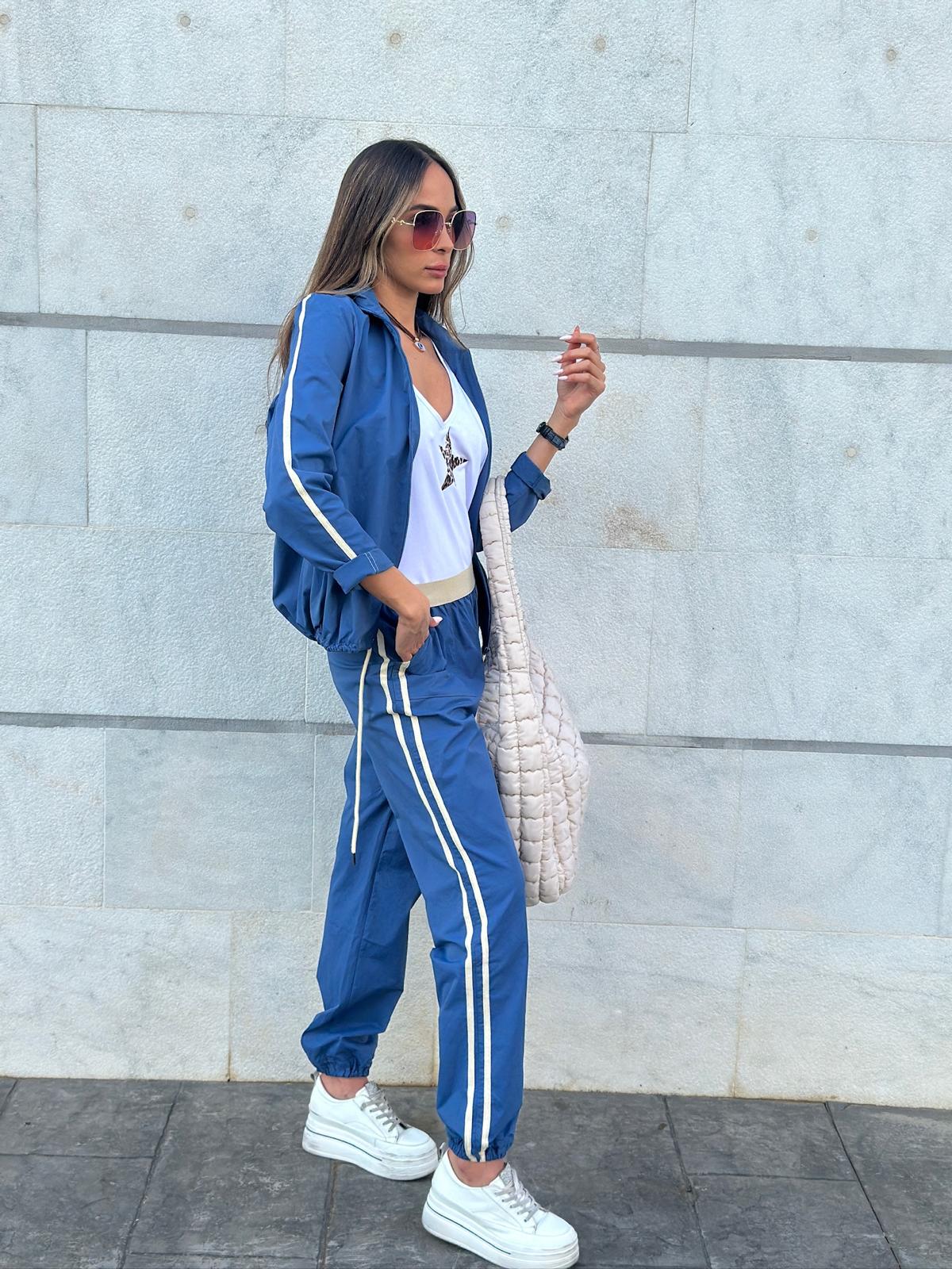חליפת 2 חלקים משולבת פסים לאורך השרוולים בג'קט ובמכנסיים. הג'קט בסגירת רוכסן, המכנסיים בשילוב כיסים.