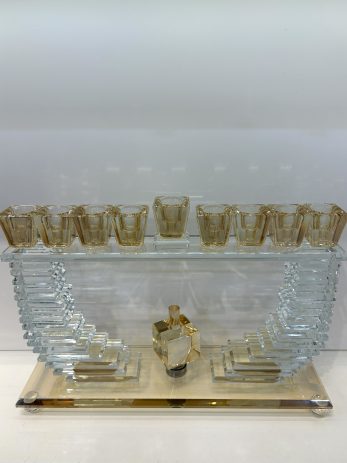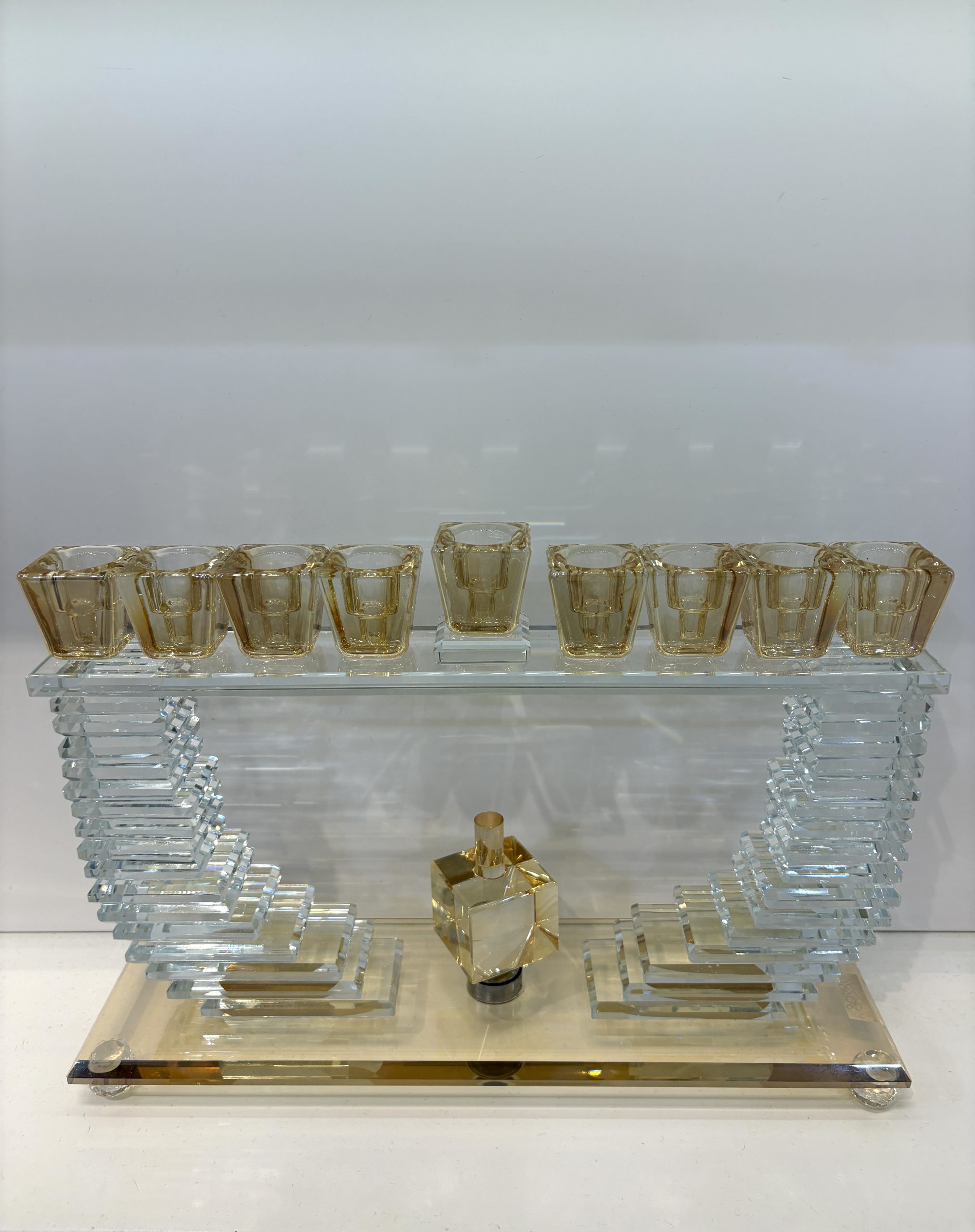 חנוכיה קריסטל שקוף זהב עם סביבון 19 ס״מ