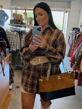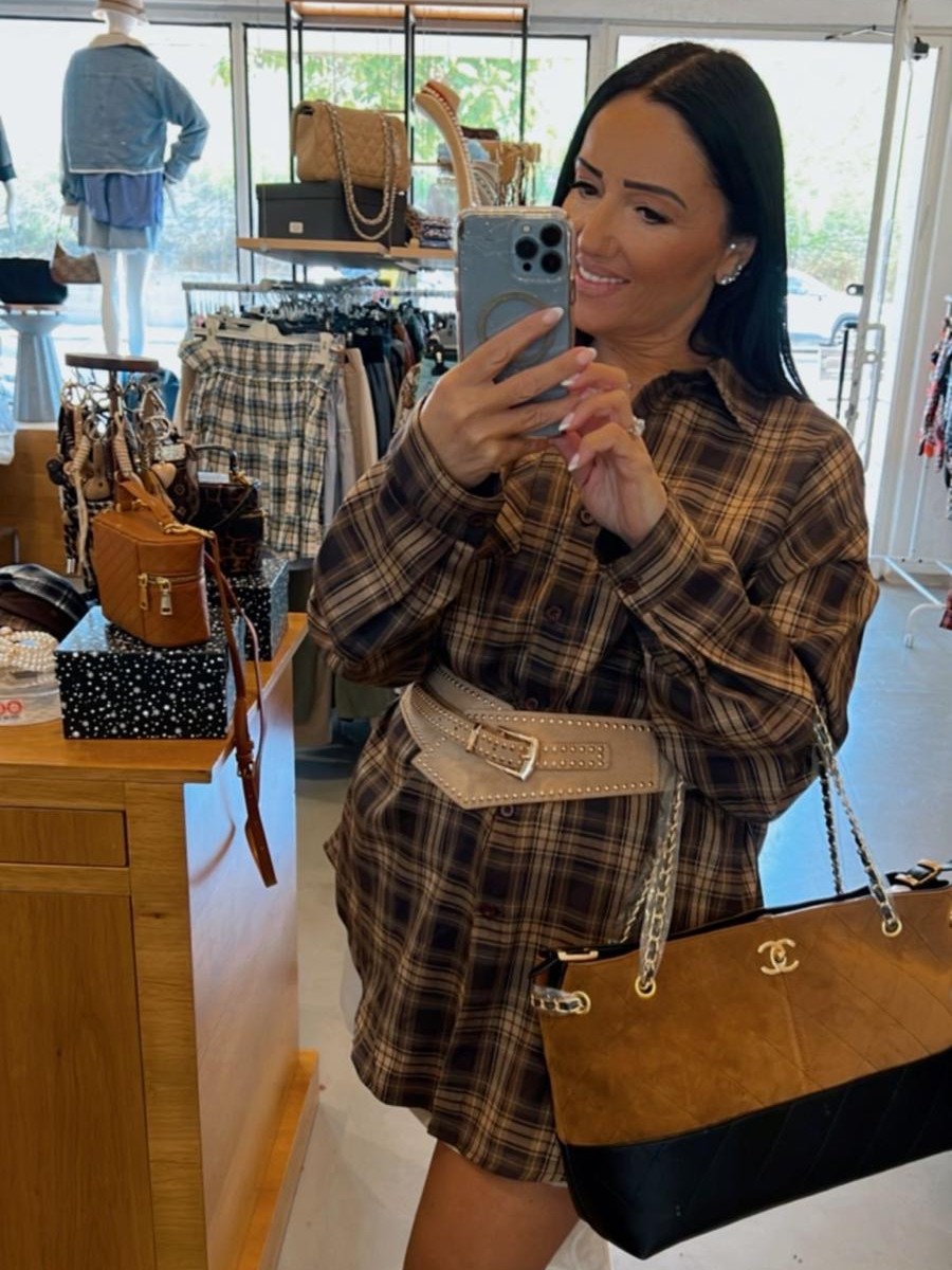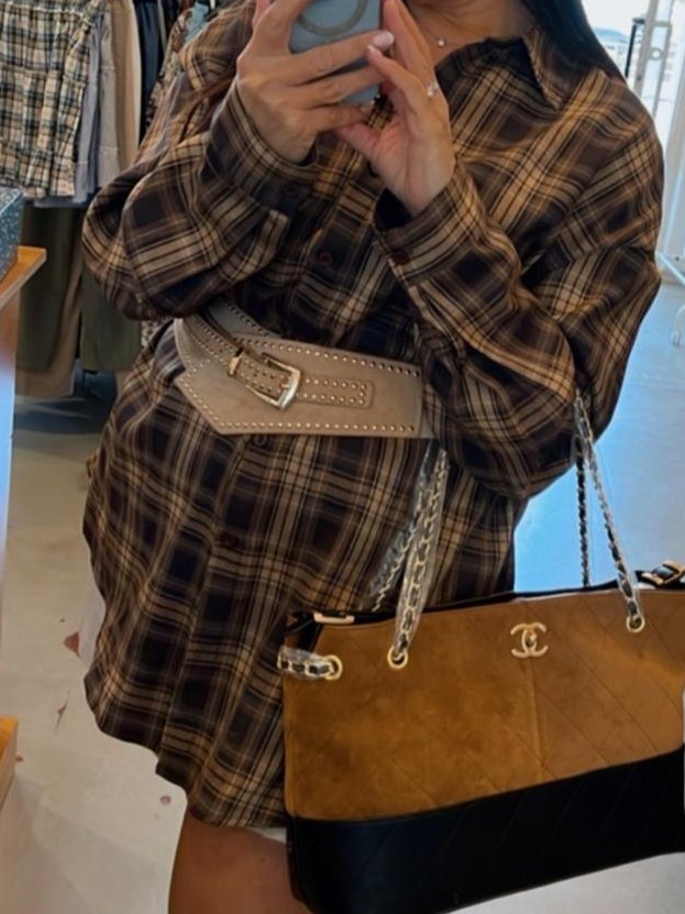 את החגורה והתיק ששילבנו בלוק ניתן למצוא בקטגוריית אקססוריז באתר. תיק שילוב לוגו וחגורת זמש ניטים