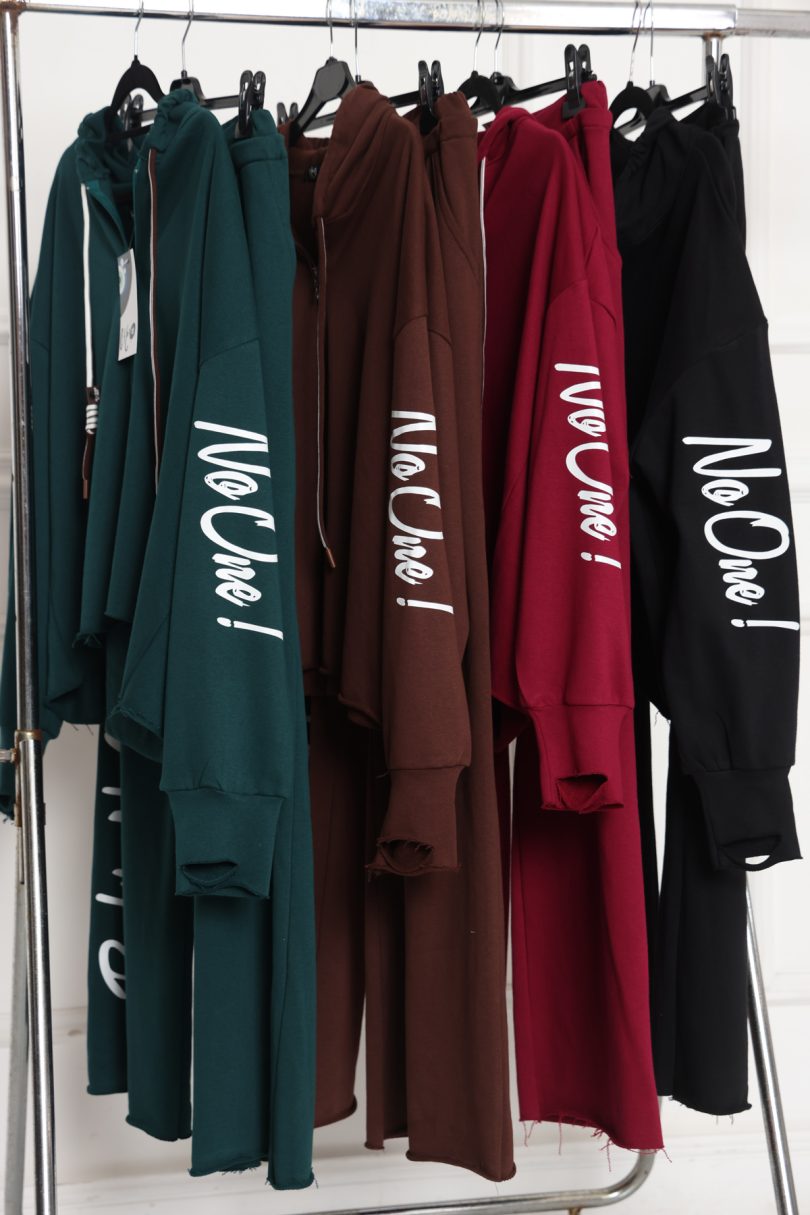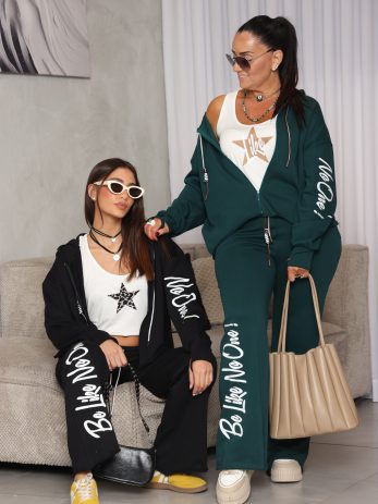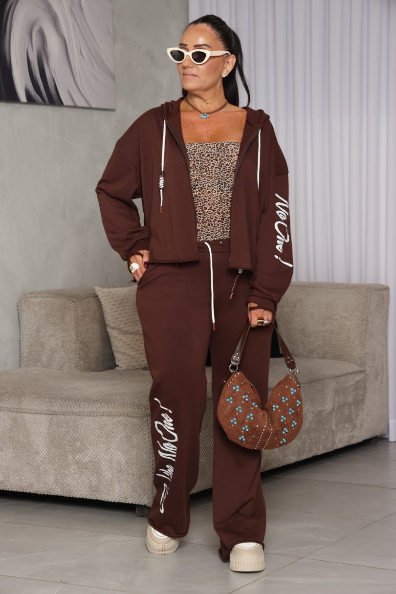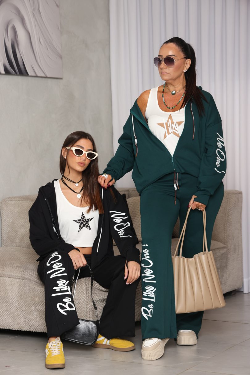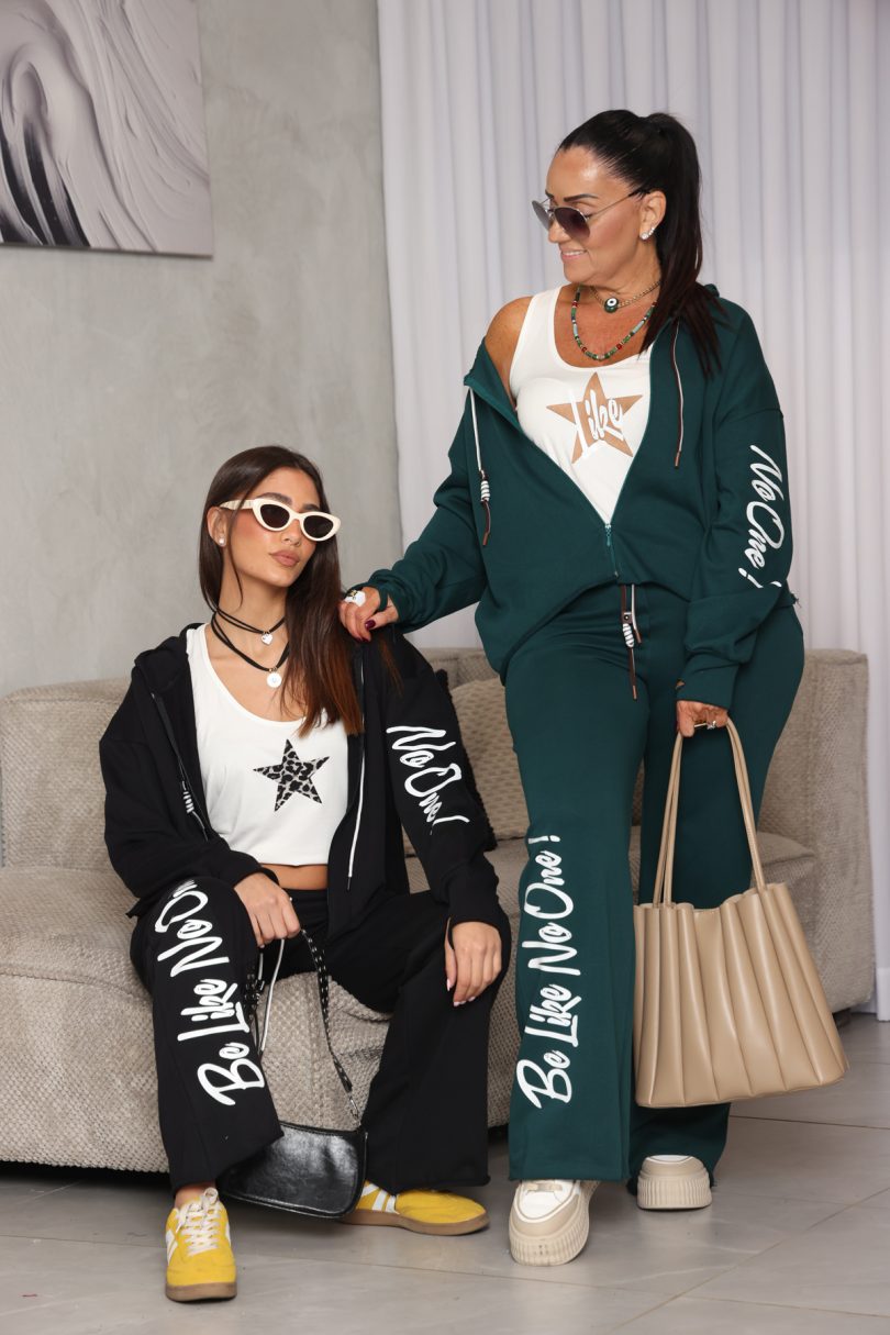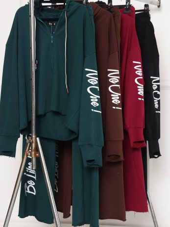 ג'קט קפוצ'ון בסגירת רוכסן ומכנסיים תואמים עם גומי במותן, לחליפה הדפסי טקסט לבנים. מידות נשים 36-46