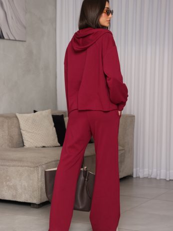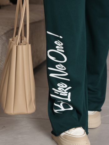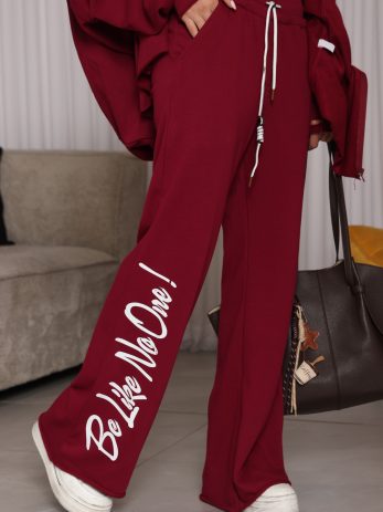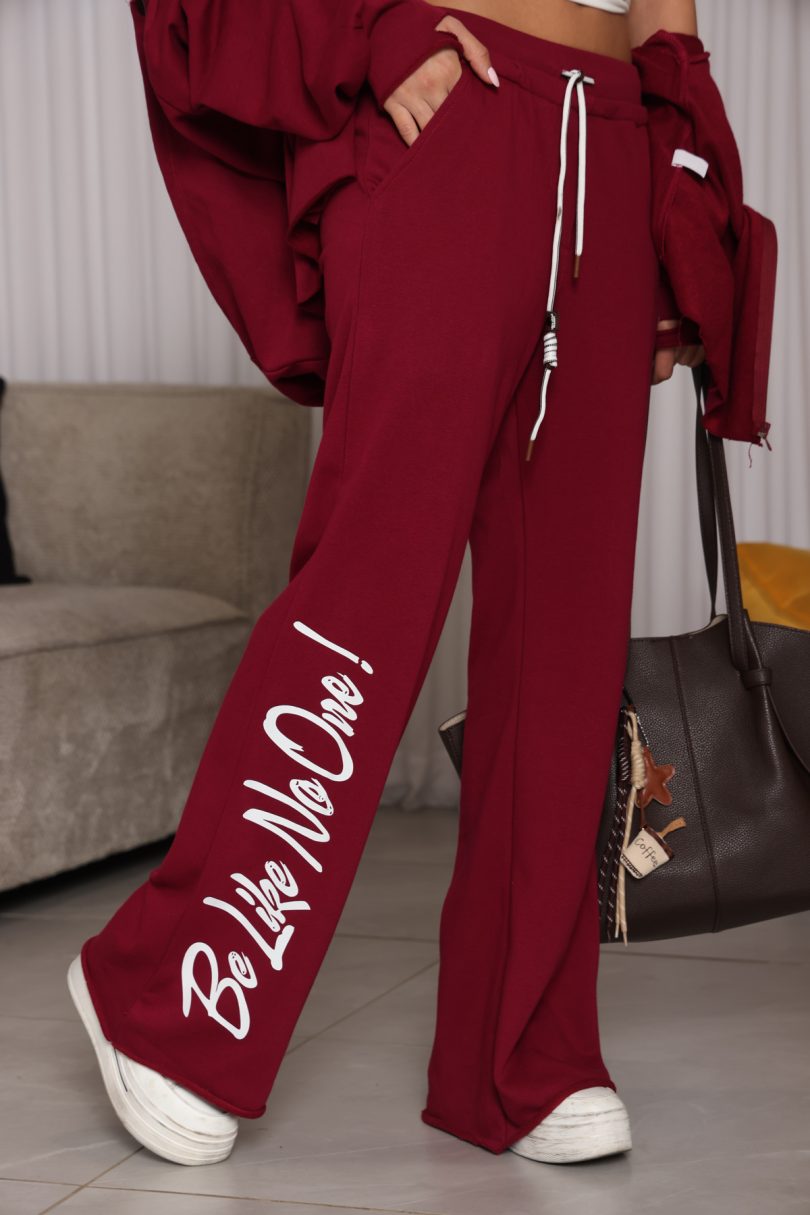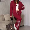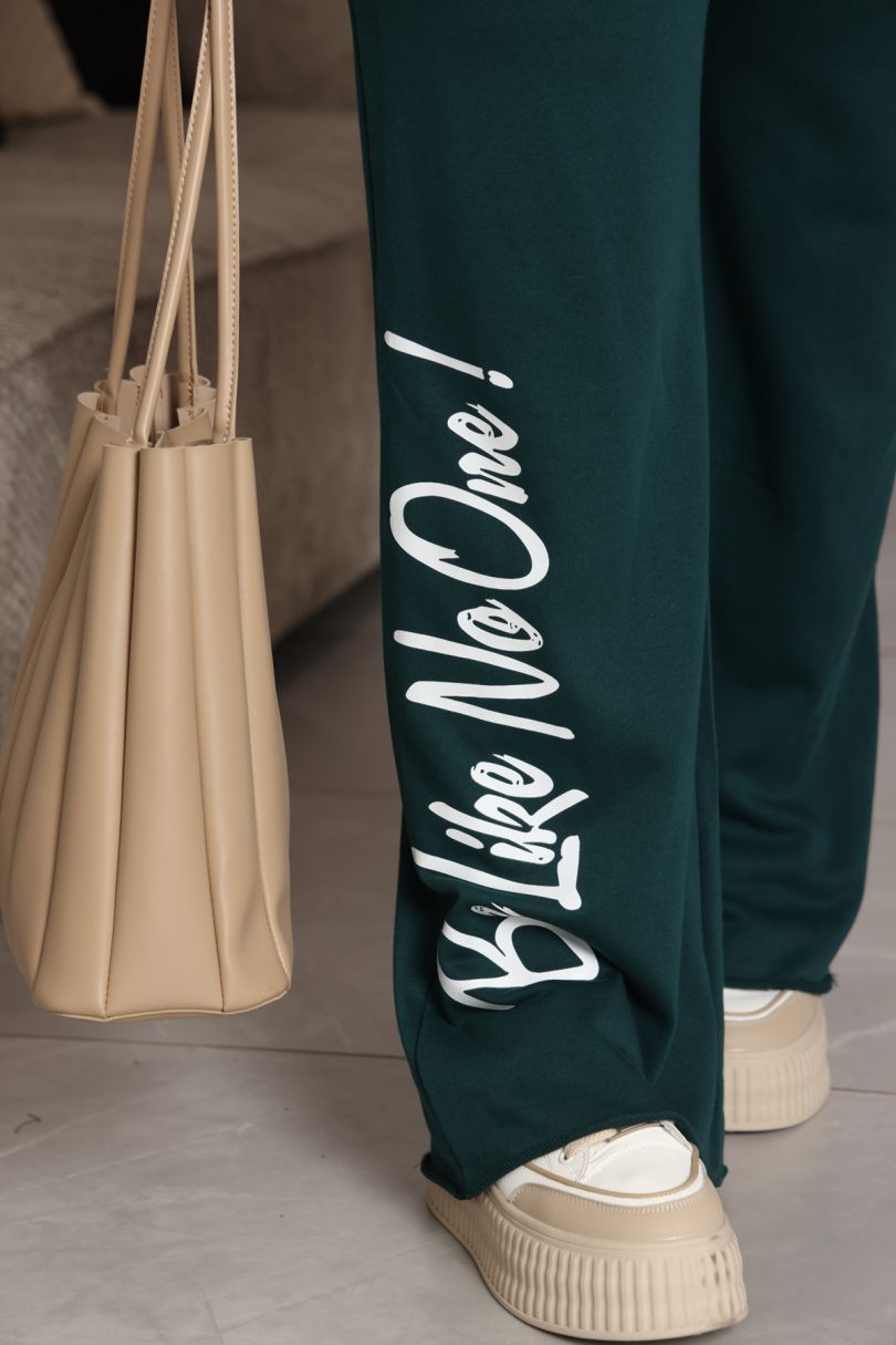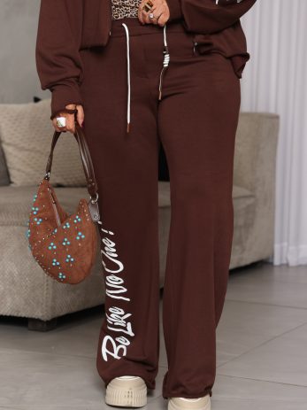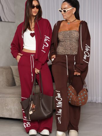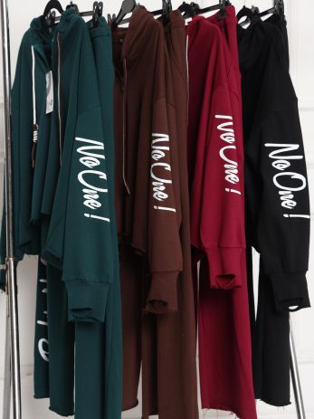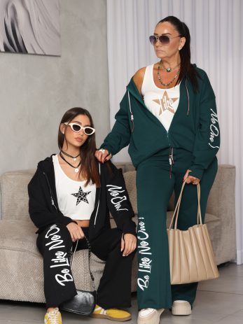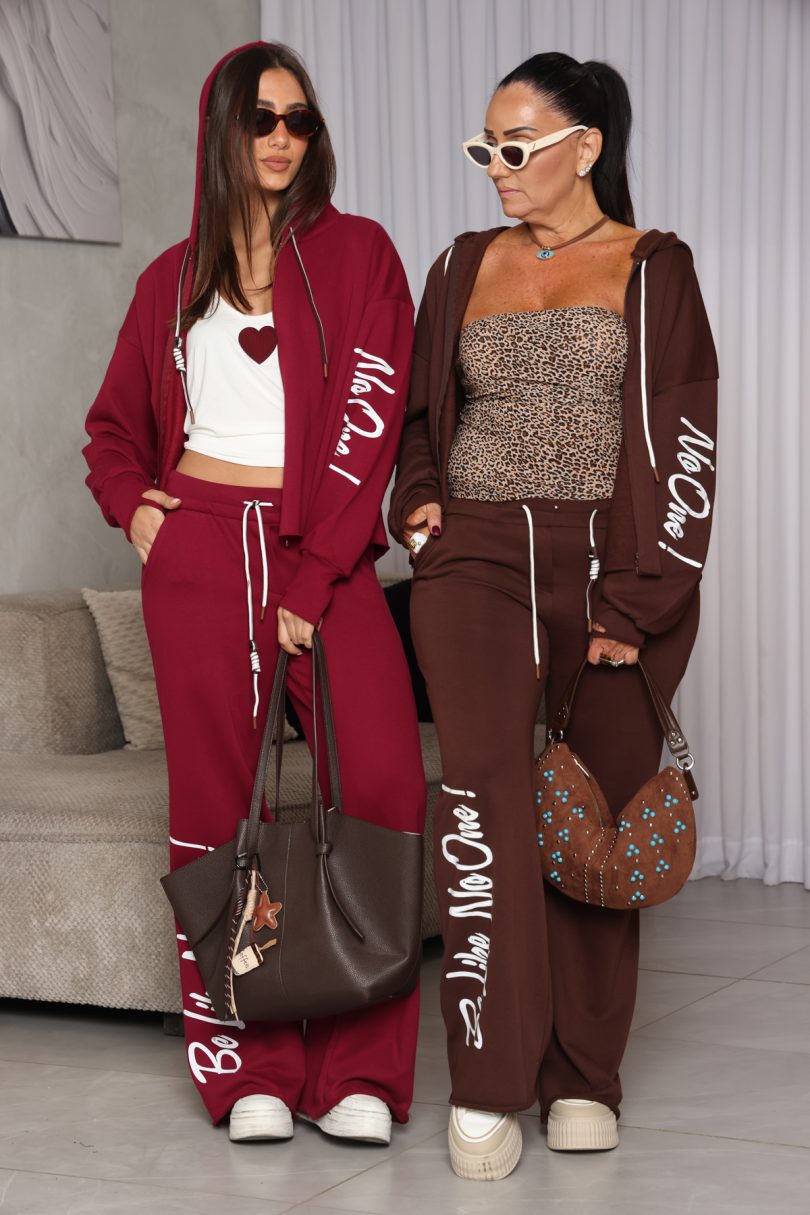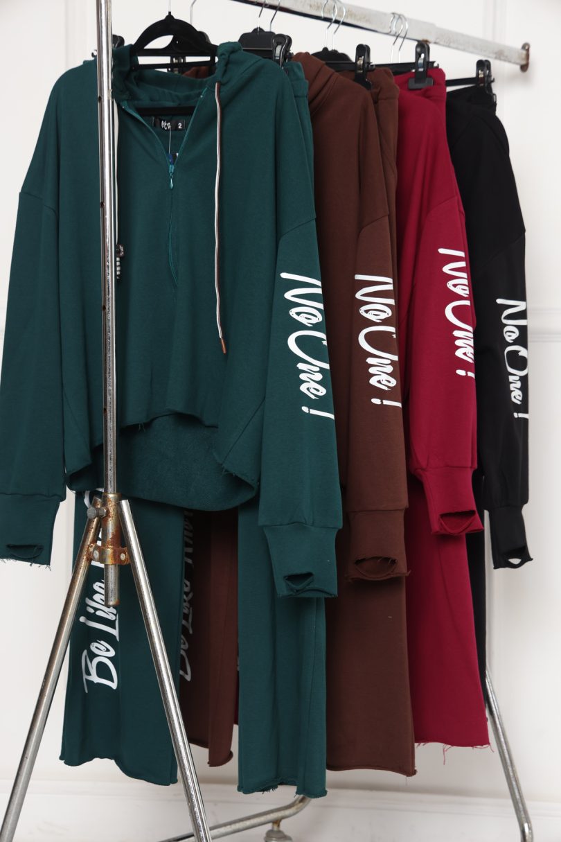 ג'קט קפוצ'ון בסגירת רוכסן ומכנסיים תואמים עם גומי במותן, לחליפה הדפסי טקסט לבנים. מידות נשים 36-46