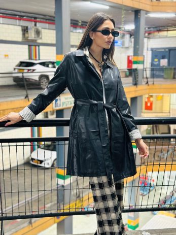 מעיל דמוי עור איכותי ומלא סטייל משולב חגורת קשירה בצבע תואם, למעיל בטנת פסים המבצבצים בקיפול השרוול.