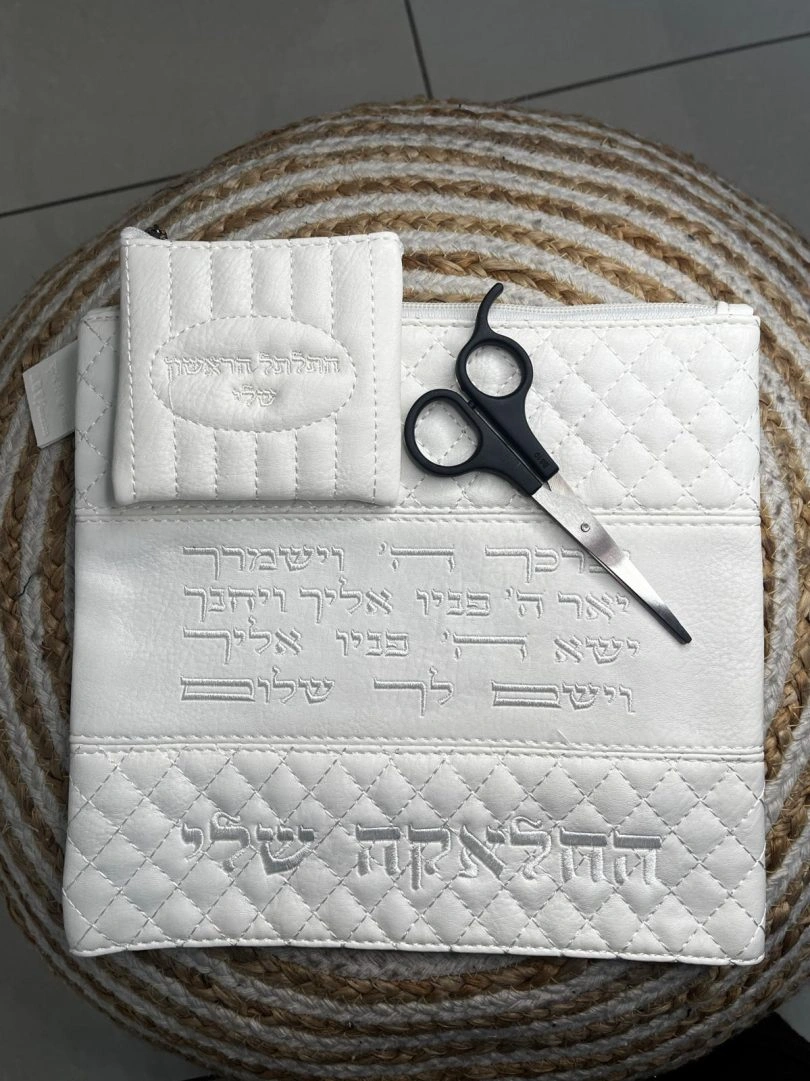 סט חלאקה מדמוי עור עם רקמה הכולל מספריים לגזירת התלתל,תיק בגודל בינוני לטלית, ותיק נסף לתלתל הראשון של הילד.