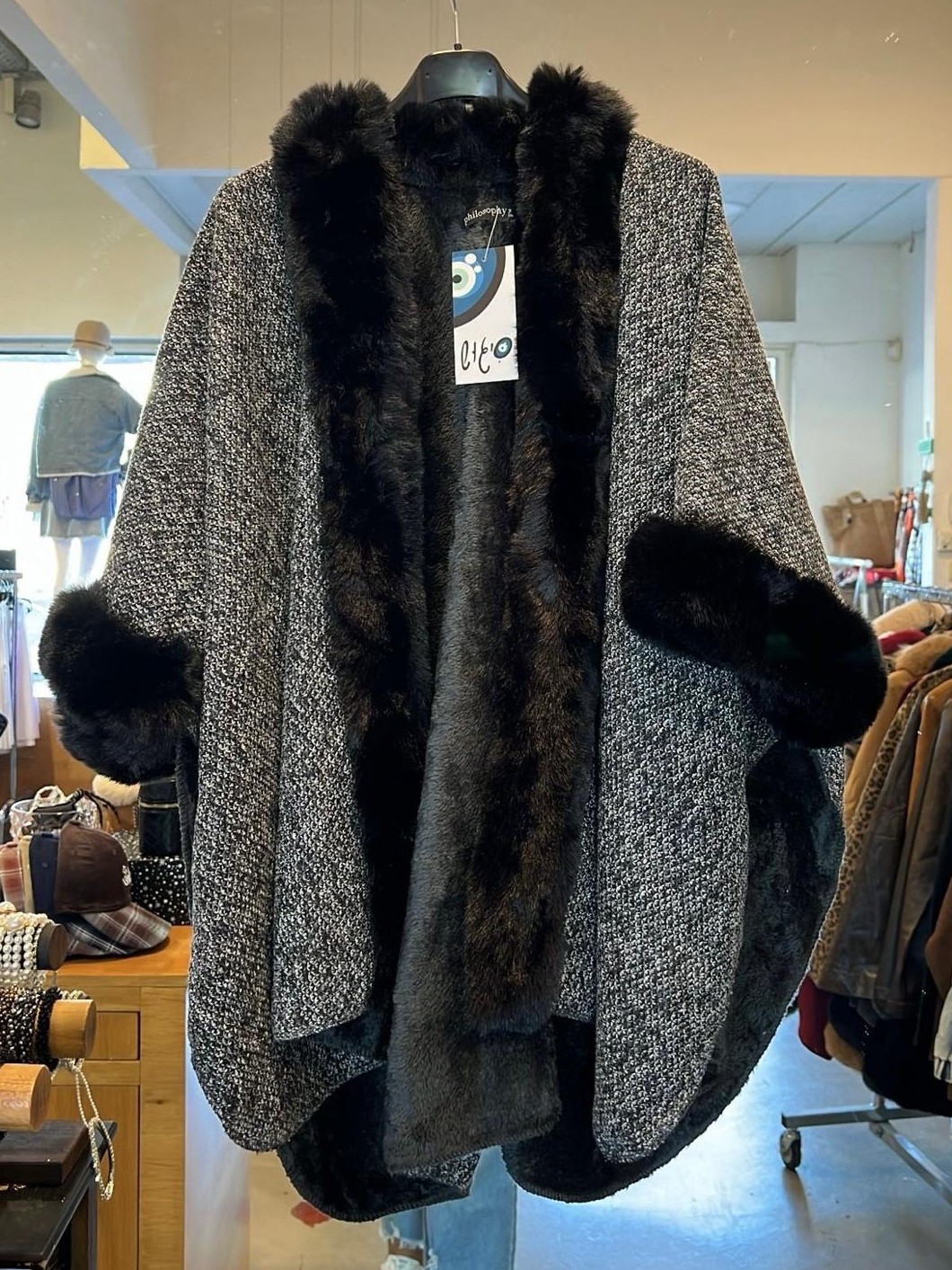 פונצו אפור משולב פרווה שחורה מקדימה ובשרוול