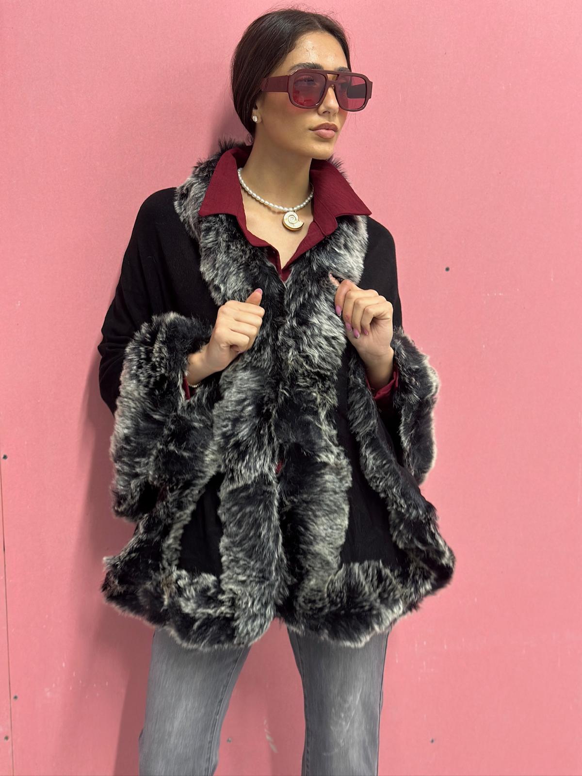 פונצו שחור משולב פרווה אפורה/ חומה מקדימה ובשרוול
