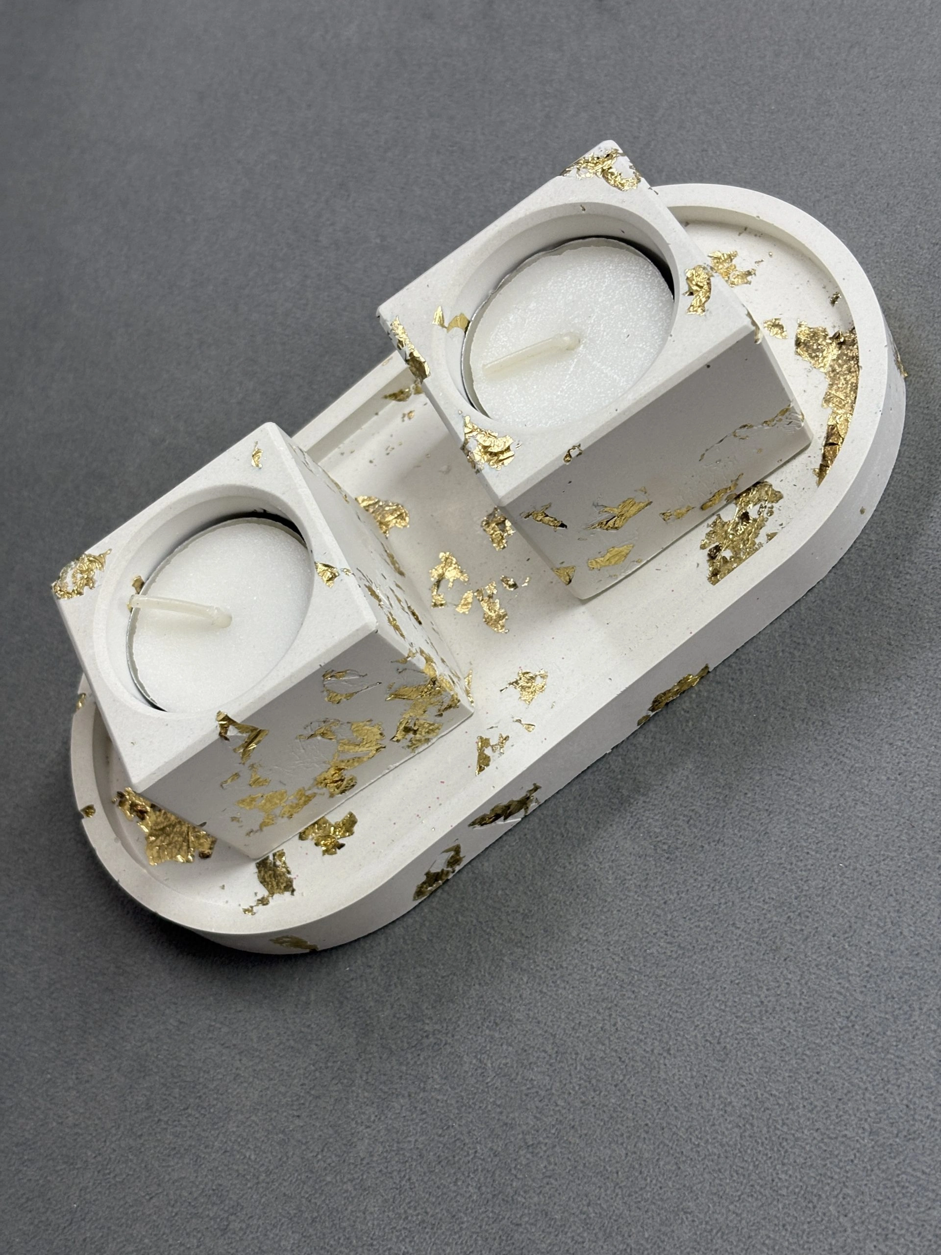 פמוטים מרובעים מבטון שילוב זהב עבודת יד, מגיע עם מגש להנחת הפמוטים או אפילו סתם לקישוט והידור שולחן השבת שלכם.