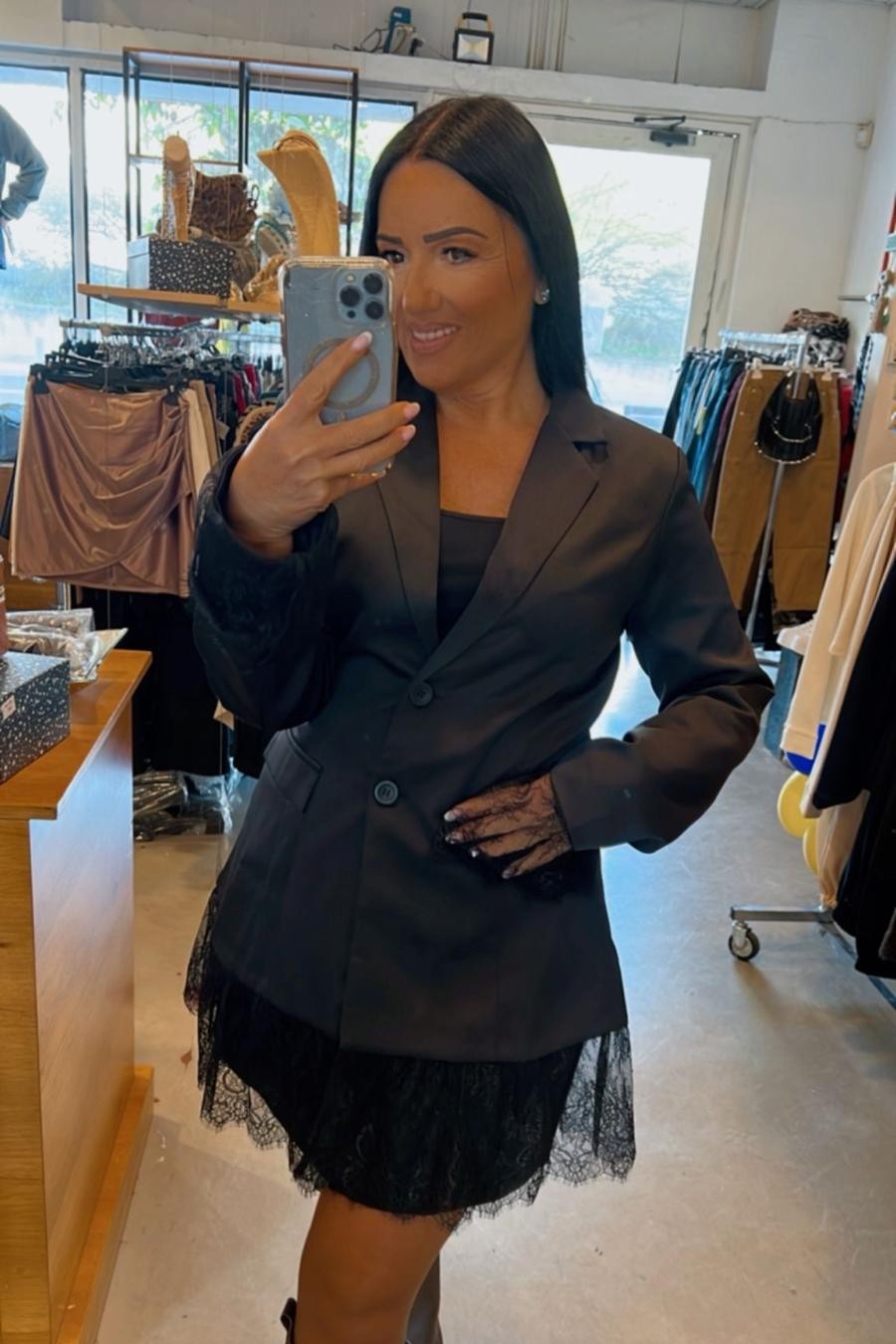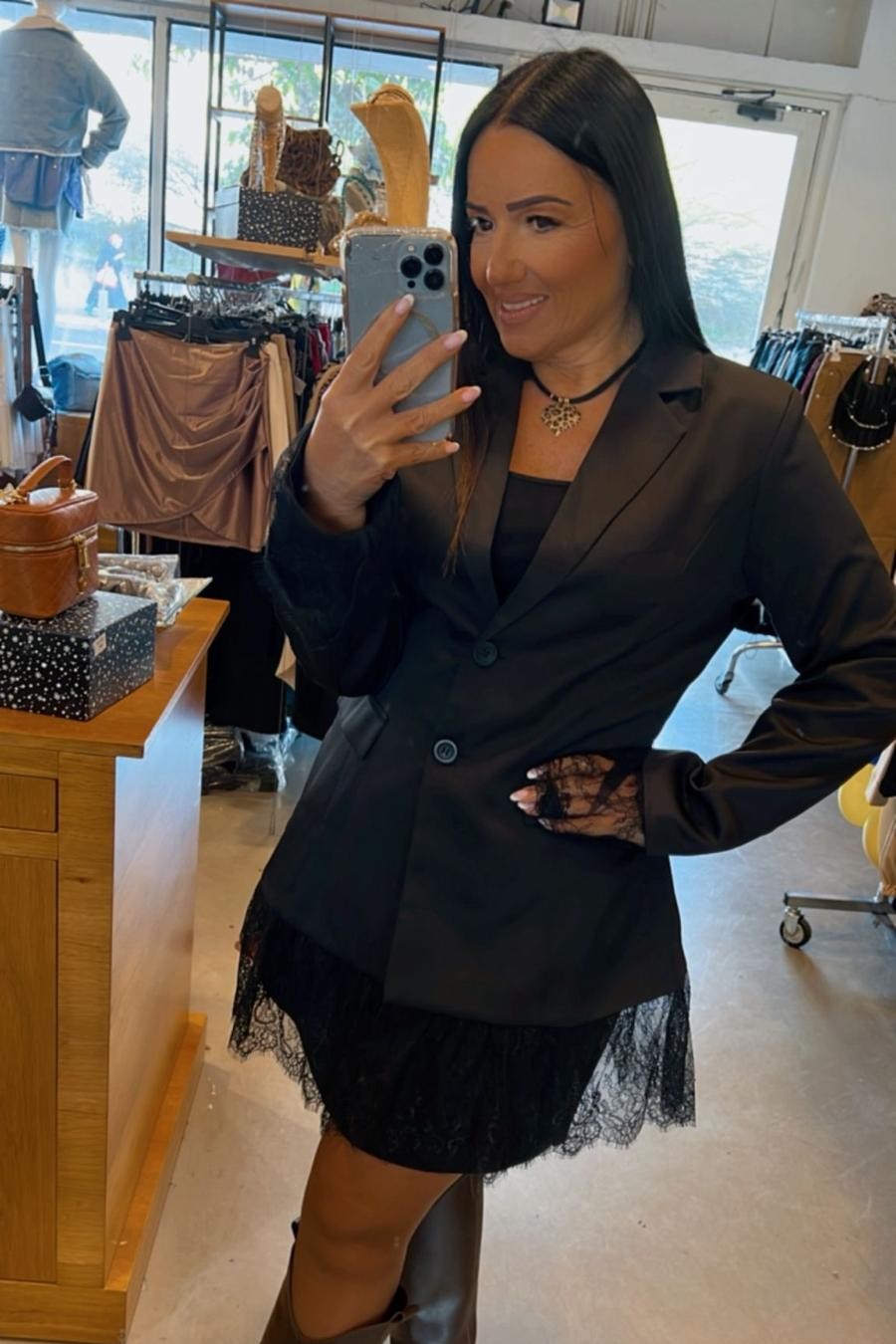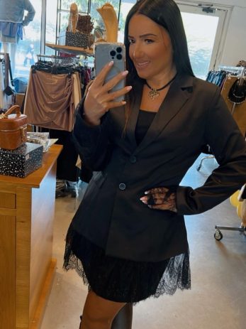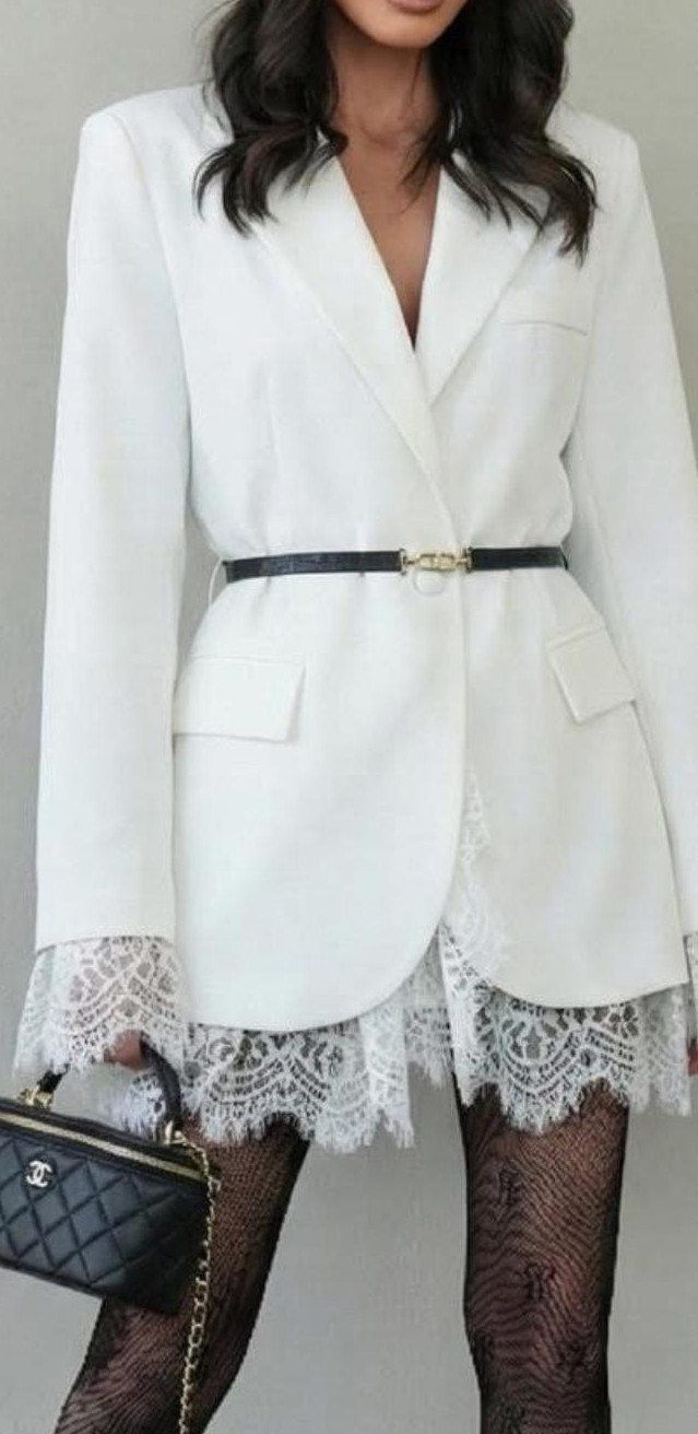 שמלה אלגנטית בגזרת בלייזר משולבת תחרה בשרוולים ובחלק התחתון