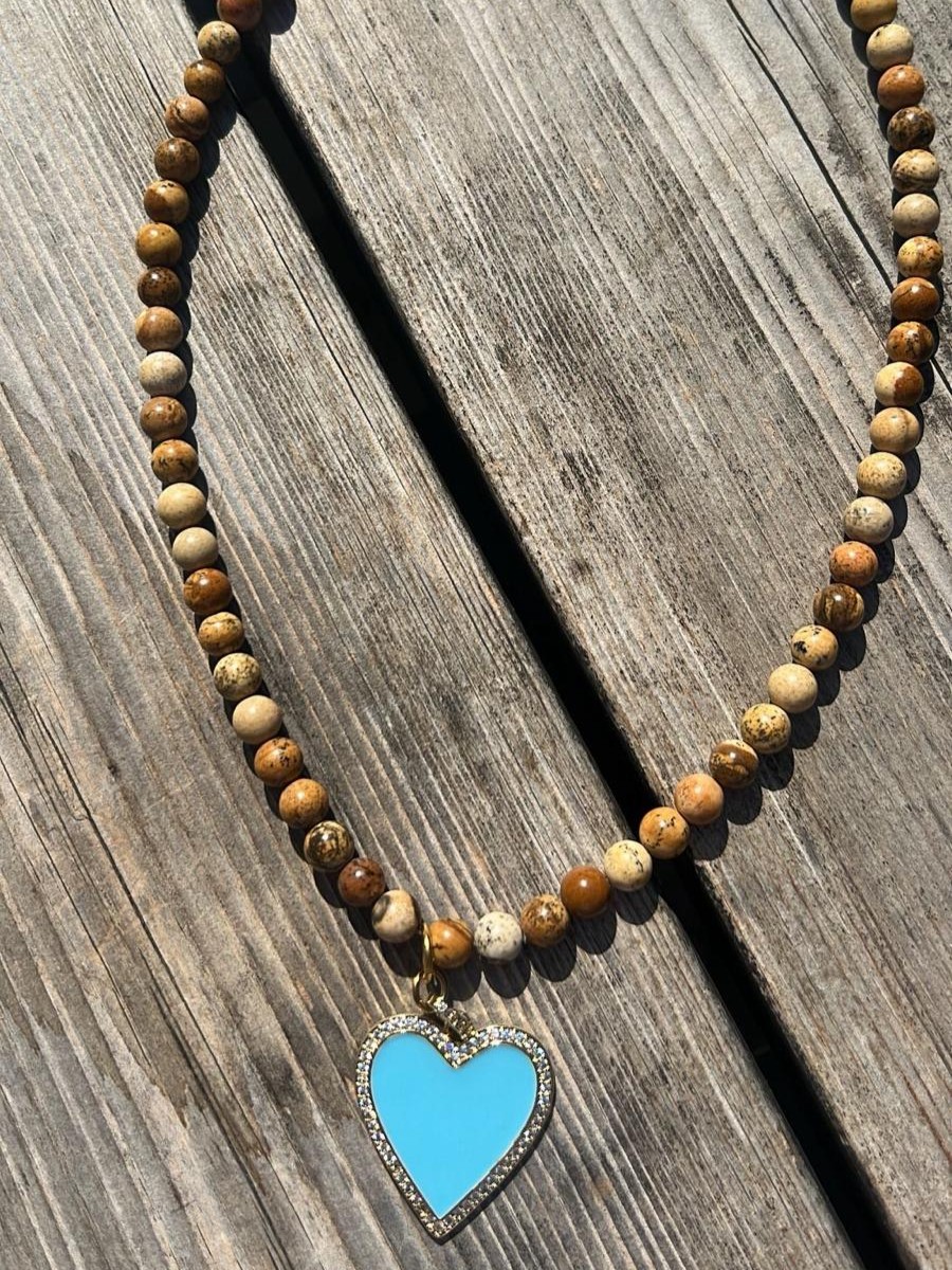 שרשרת מלאת נוכחות, עיגולים חומים משולבת תליון לב טורקיז
