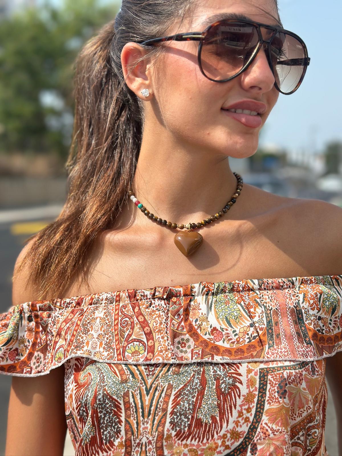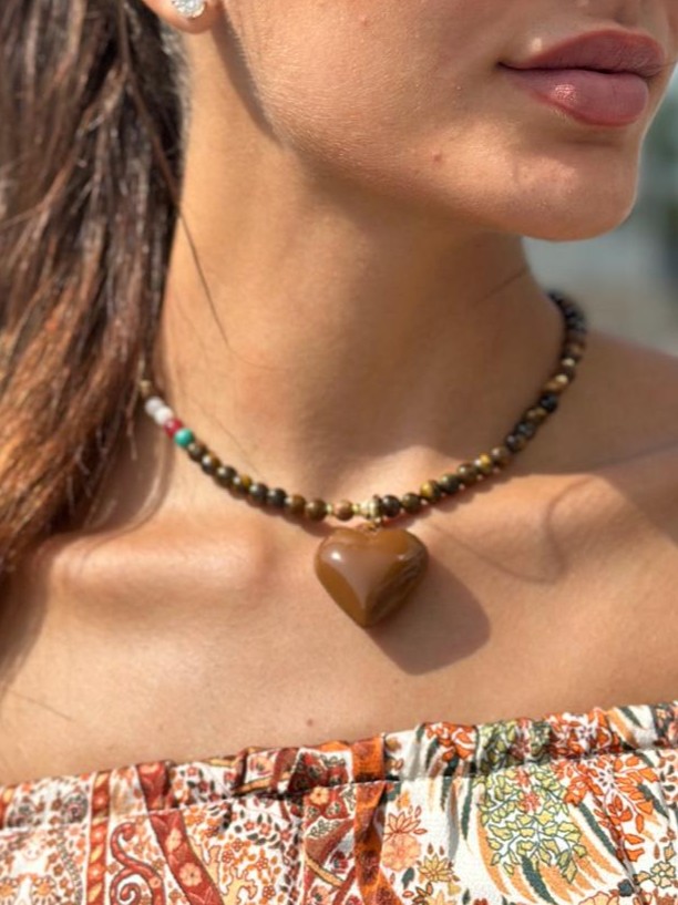שרשרת חרוזים חומים משולבת תליון לב גדול ומלא נוכחות
